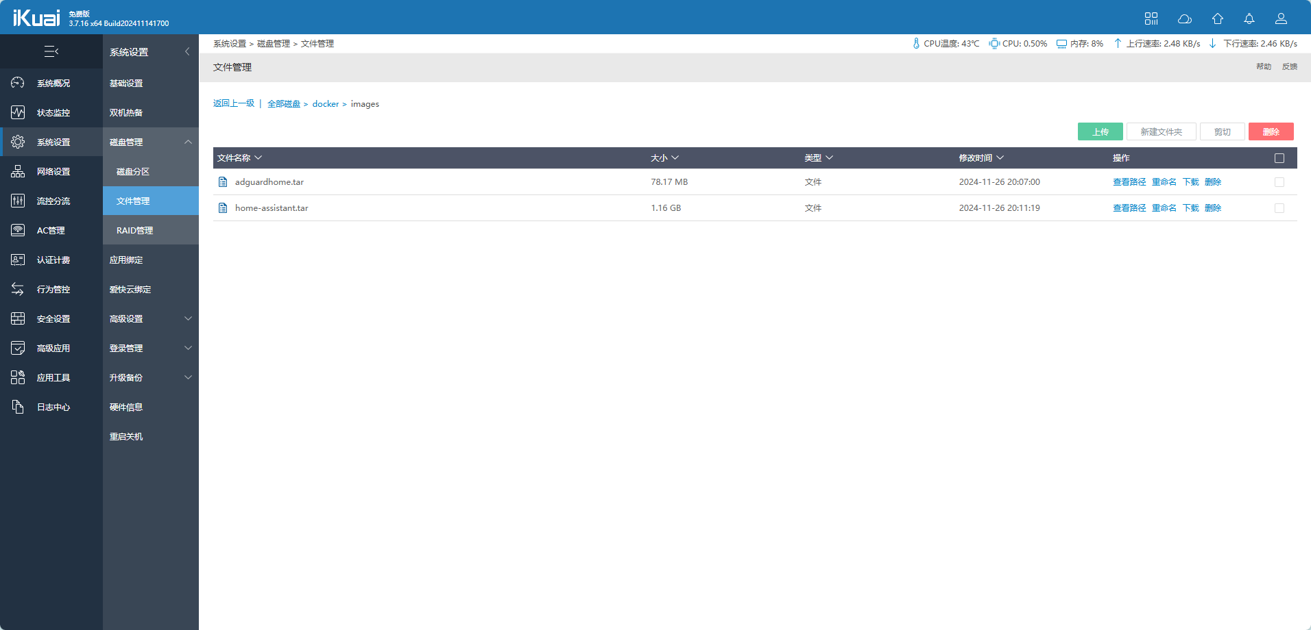 在 系统设置 > 磁盘管理 > 文件管理 中上传自己的镜像。