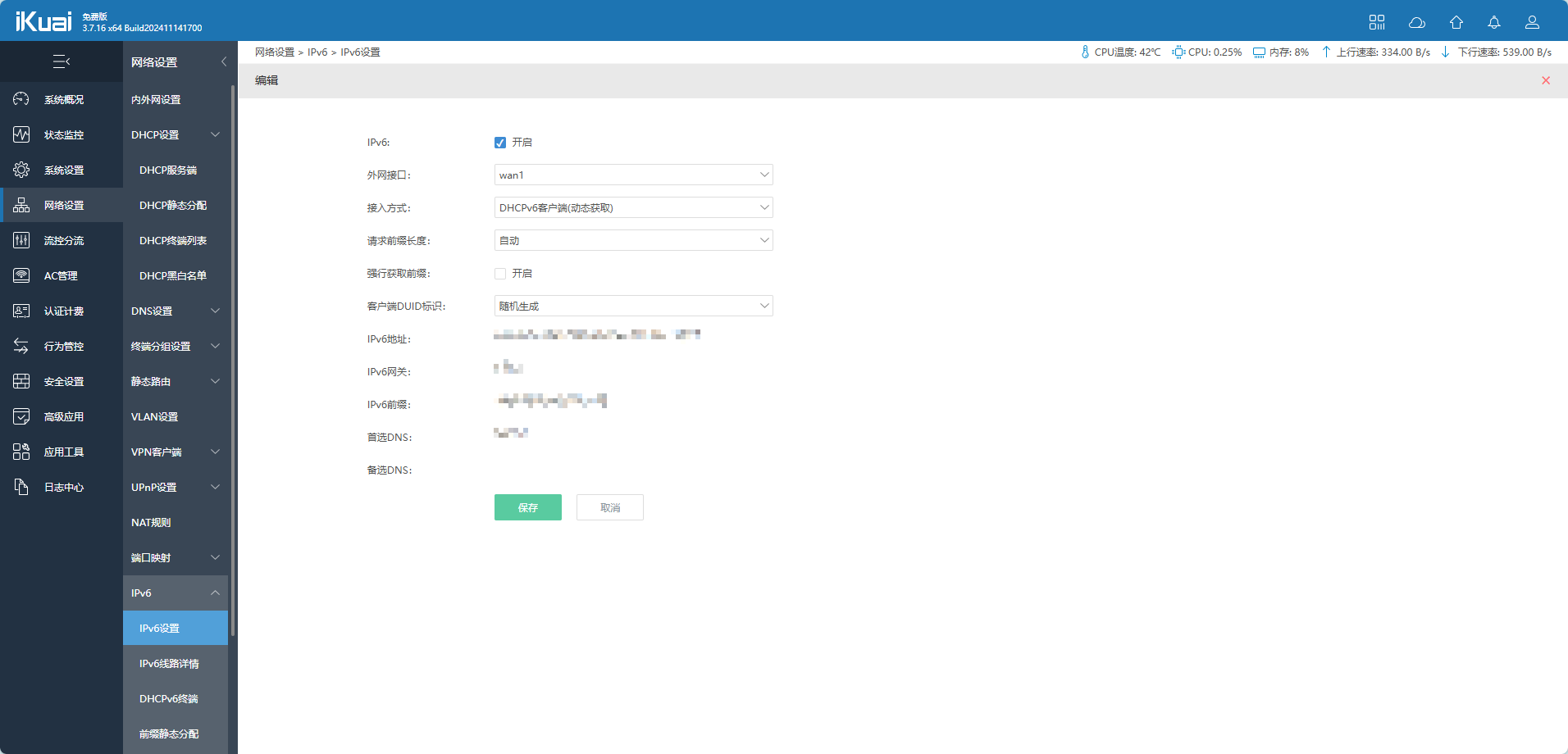 图14)我设置的是 fd32::/64,你们也可以设置其他的,比如 fe00::/64 等,但是不要设置 fe80::/64。