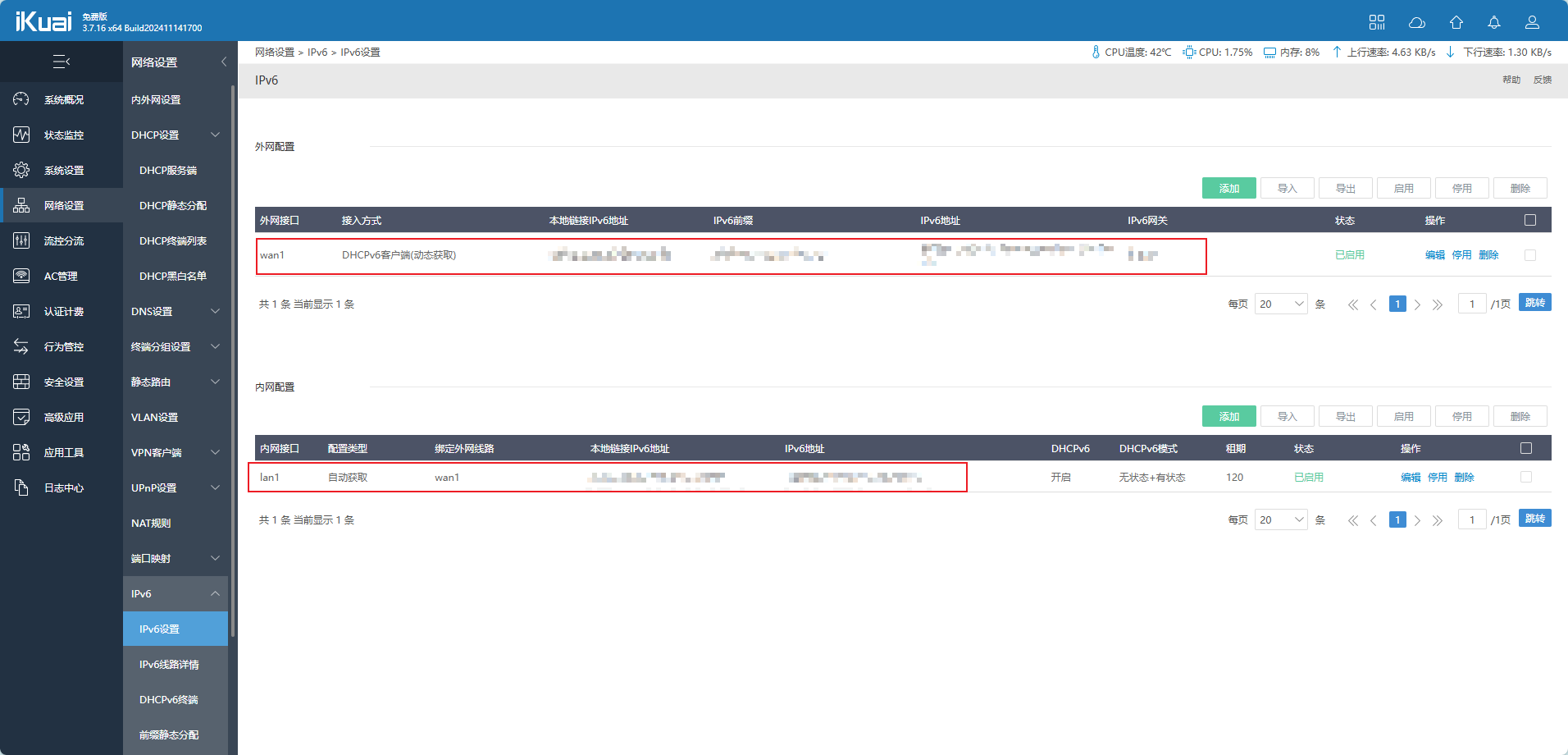 fd32::/64,那么选一个同网段的地址,填fd32::2,fd32::1已经作为网关使用了,不填也可以,会自动分配 - 开机自启:选择上(要不爱快