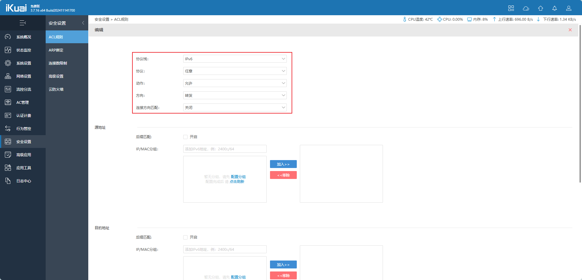 图37)第一条规则会导致内部的 IPV6 无法访问外部,所以需要建立第二条规则,让内部的 IPV6 访问外部。