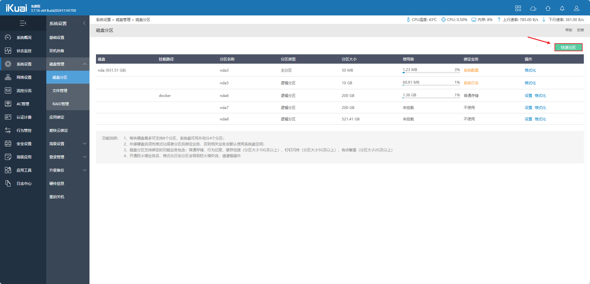 | 绑定业务 | 系统配置及系统日志分区为固定分区并标识为黄色;自定义分区可绑定5类业务,分别为普通存储、有余繁星、缓存加速、行为记录和钉钉闪传 |