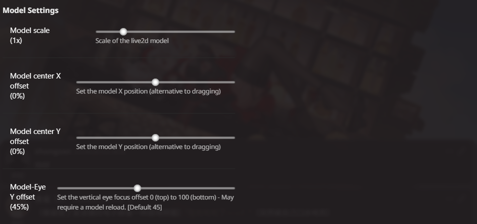 图9)Model scale(模型缩放):使用滑块调整模型的大小,使其变大或变小。Model center X offset(模型中心 X 偏移):使用滑块更改模型相对于窗口中心的水平位置。Model center Y offset(模型中心 Y 偏移):使用滑块调整模型相对于窗口中心的垂直位置。Model-Eyey offset:调整垂直方向上眼睛注视焦点(eye focus)的偏移量。这个设置允许用户指定模型在垂直方向上眼睛注视的位置,数值范围是从0到100,其中:0表示眼睛聚焦在最顶部,100表示眼睛聚焦在最底部,默认值为45,这通常意味着默认情况下眼睛聚焦位置偏向中间靠上一点。