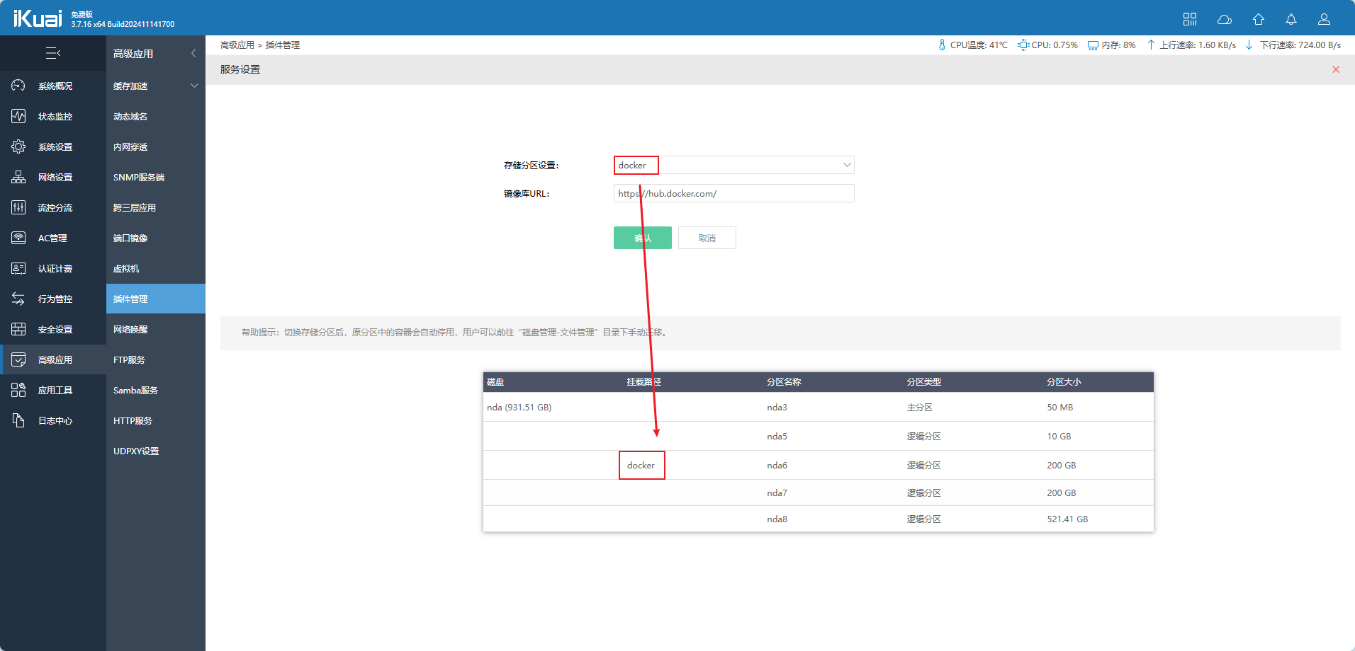 | 绑定业务 | 系统配置及系统日志分区为固定分区并标识为黄色;自定义分区可绑定5类业务,分别为普通存储、有余繁星、缓存加速、行为记录和钉钉闪传 |