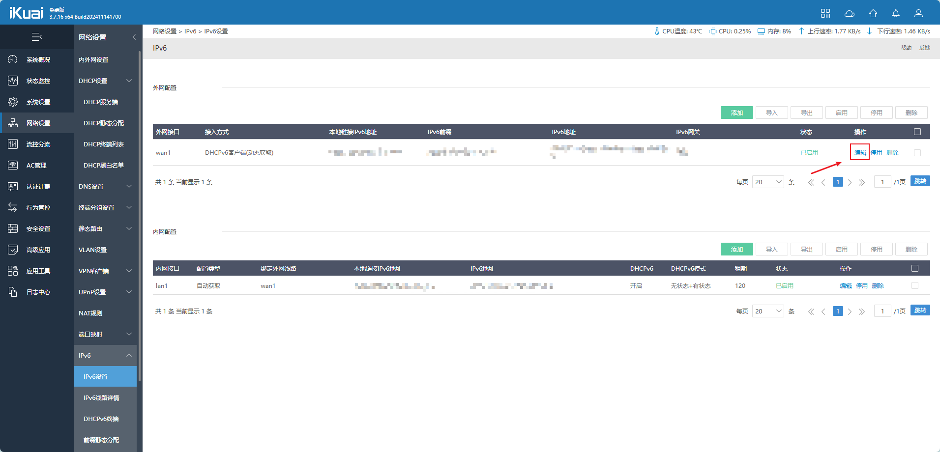 192.168.10.0/24,那么选一个同网段的地址,填192.168.10.10 - IPv6地址:我在接口管理中设置的是