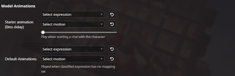 图10)Starter animation:从列表中选择表情和动作,这些将在与角色开始聊天时播放。如果您需要隐藏角色一段时间以达到完美效果,还可以添加延迟,在此期间模型将不可见。Default Animations:从列表中选择表情和动作,这些将在角色发送消息时播放。使用分类表情扩展时使用回退动画。