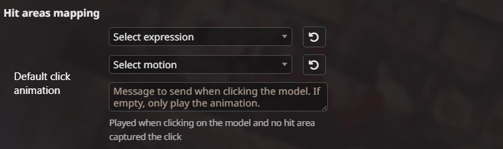图11)Default click animation (默认点击动画):从列表中选择表情和动作,这些将在您点击模型时播放。您还可以设置一条将作为用户消息发送的消息。