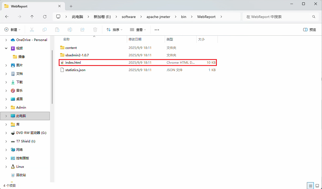 会在 E:\software\apache-jmeter\bin\WebReport 下生成 WebReport 文件夹,文件夹中的 index.html 就是压测报告。