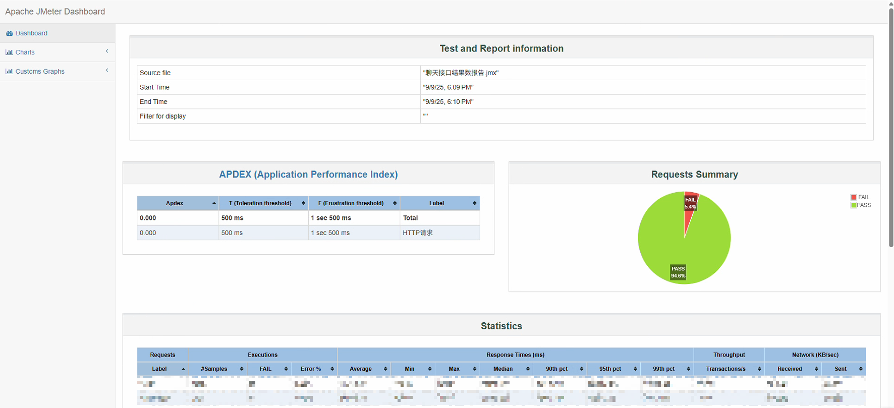 - 响应时间统计:平均响应时间、中位数、90%和95%百分位响应时间